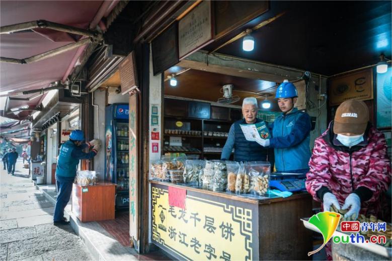 11月28日,在浙江省第二批“无废商业街区”重点培育对象——溪口镇溪巷里景区,青年党员正逐户排查配电箱、空调外机等设备接线处隐患,同时向商户发放冬季用电安全手册,讲解节能设备操作技巧。