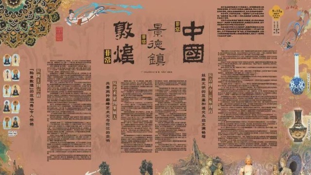 展厅入口处,比展品更先“登台”的,是一本本与敦煌与瓷都有关的书籍。《中国敦煌壁画全集》《景德镇陶瓷史》等书被游客们一一翻开,翻起的书页,就像一双双翅膀,飞向了浩瀚的中华文明历史长河。而这群飞鸟,最先落在了茫茫沙漠。本次特展的第一篇章“大漠瓷音:丝路瓷缘的千年叙事”便以瓷为媒,聚焦敦煌壁画在不同陶瓷工艺中的转译与再创造,推动敦煌艺术在视觉质地、创作载体、艺术语言等方面实现多重突破。