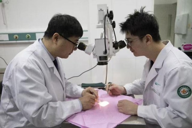 经过专家团队显微镜下反复寻找,最终也只找到了一根动脉和一根静脉,完成缝合。血管直径已经如此之细,缝合用的线需要更细。卢立春采用10—0缝合线在显微镜下进行缝合,经过七个小时左右的手术,最终完成断指再植。
