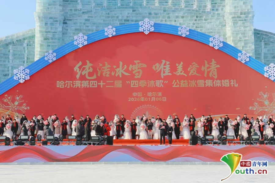 中国青年网讯(记者 夏烯然)1月6日,哈尔滨第四十二届“四季沐歌”公益冰雪集体婚礼在哈尔滨冰雪大世界举行。来自黑龙江、吉林、辽宁、山西、浙江、贵州、山东、广东等18个省、自治区和直辖市的42对新人,在冰雪雕琢的童话世界里携手步入婚姻殿堂,以冰雪为媒、以城市为鉴,共同开启人生新篇章。