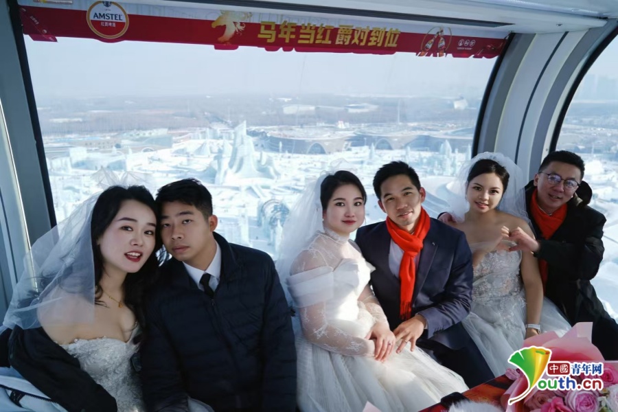 新人在冰雪大世界坐摩天轮。哈尔滨青年宫供图