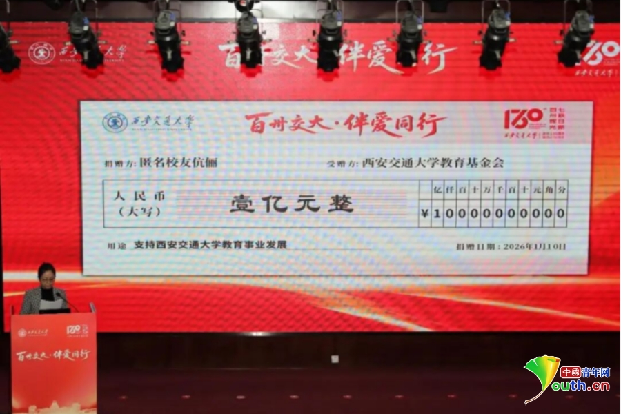 中国青年网讯 1月10日,西安交通大学“百卅交大·伴爱同行”捐赠仪式在兴庆校区举行。活动现场,一对校友伉俪怀揣对母校的深沉情谊,匿名慷慨捐赠1亿元,成为本次仪式最大单笔捐赠,引发广泛关注。