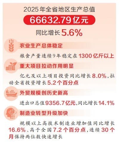 2025年全省地区生产总值66632.79亿元,同比增长5.6%。分产业看,第一产业增加值5538.08亿元,同比增长3.6%;第二产业增加值24926.80亿元,同比增长5.5%;第三产业增加值36167.92亿元,同比增长6.0%。