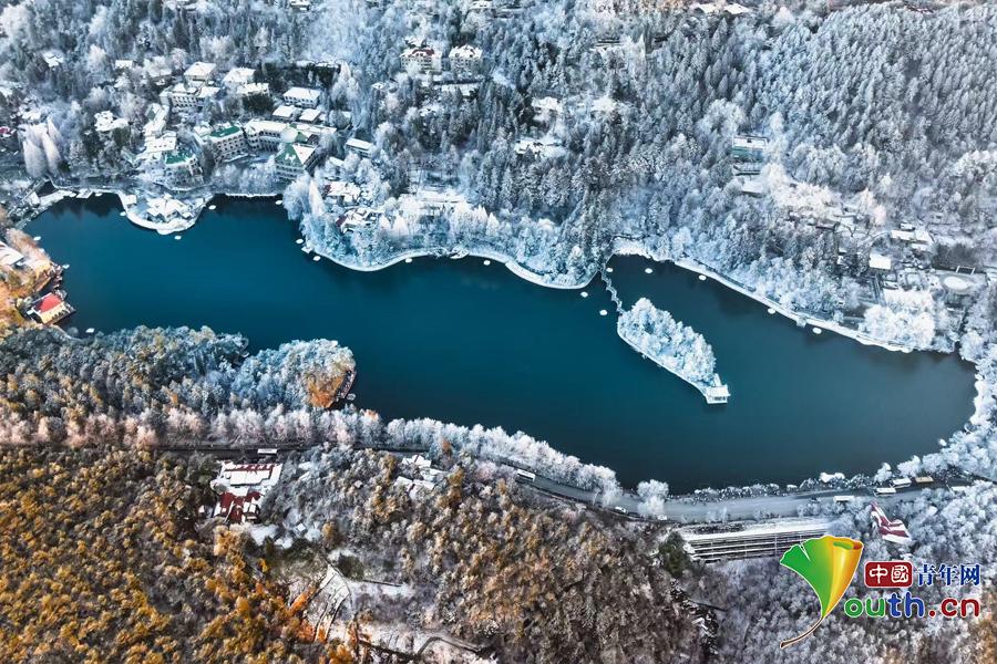 雪霁后的庐山小天池,覆雪的山林与屋舍环抱着湛蓝湖水,雾凇似银装裹满岸畔,从高空俯瞰如一幅冰玉雕琢的冬日秘境图。张新红 摄