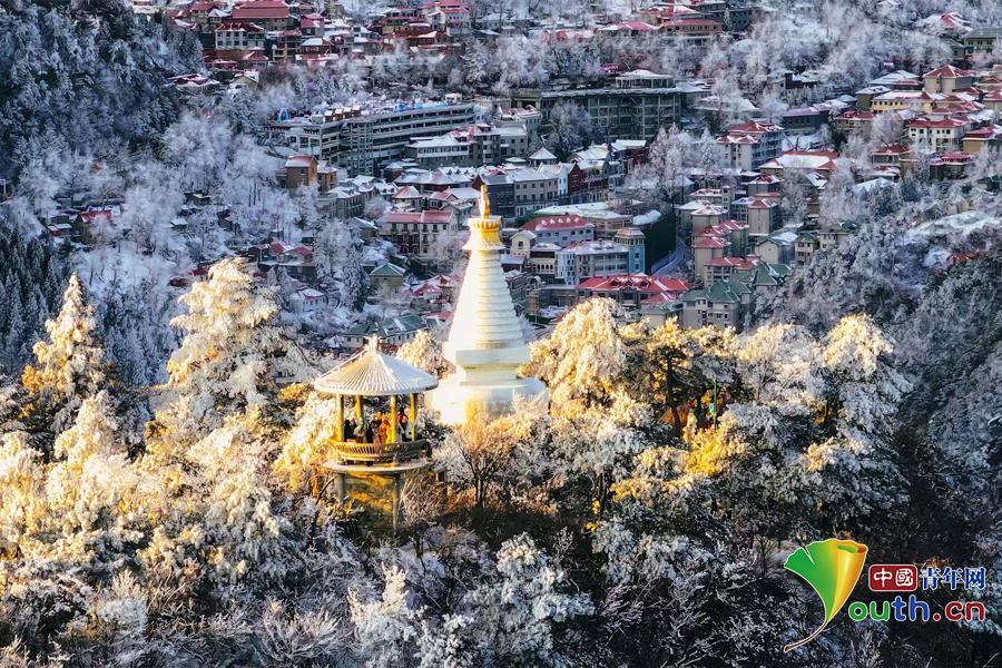 旭日、雪峰、古塔、闲亭在这方海拔千米的山巅相融,共同构成一幅冬日画卷,展现出静谧而壮美的自然景象。(张新红)