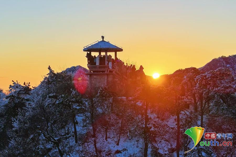 旭日跃出山峦,庐山小天池无住亭挤满观景游人,晨光穿过雪枝洒在亭台,冰棱与暖光交织成冬日限定的温柔画面。张新红 摄