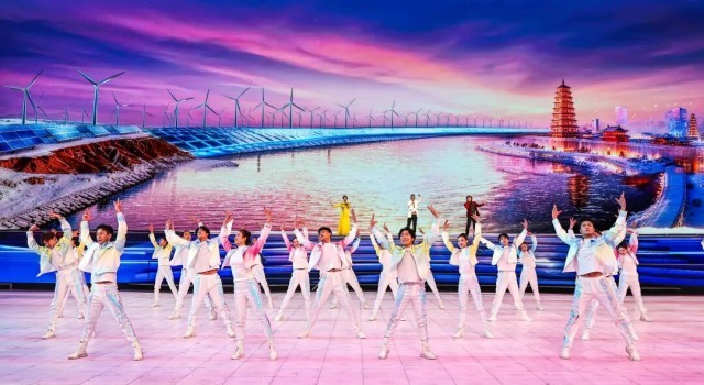 中篇《沸冬腾雪》以“运动”为景,呈现竞技冰雪运动的热血风采和群众冰雪运动的鲜活图景,将“冷运动”演绎成“热狂欢”。《冰封竞多娇》节目中,数控矩阵瞬间转换为高山滑雪赛道、速滑冰道、冰球场馆,威亚演员如飞鸟凌空,演绎跳台滑雪的惊险;地面舞者疾驰回转,再现短道速滑的激情。而《雪飘看今朝》节目将三秦大地冰雪运动融入大众生活、全民健身蔚然成风的时代画卷徐徐展开,彰显了“三亿人参与冰雪运动”的生动实践与陕西冰雪产业的无限魅力。