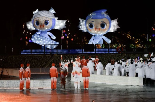 紧接着,主火炬塔后方升起的无人机编队化为冰雪精灵,呈现运动激情、冰雪奇观、榆林文脉、陕西符号与新春气象的璀璨交响,最终勾勒并点亮本届冬运会主题口号“逐梦冰雪 陕耀未来”,于塞北苍穹绘就陕西冬运的活力图腾。