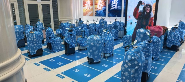 游客们的行李箱上被罩上了蓝色雪花“外套”(图片由受访单位提供)