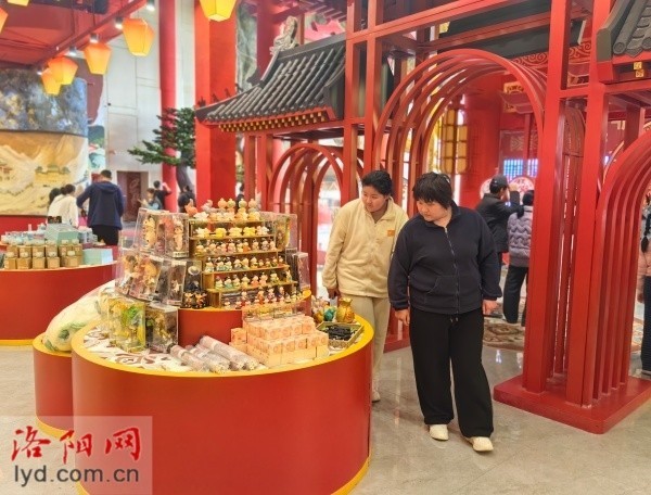 步入室内,23米挑高大堂开阔大气,“七彩祥云”顶灯璀璨夺目,唐三彩与牡丹纹样点缀其间,尽显盛唐气象。一层为热闹的“神都御宴”餐饮区,二层集合文创商铺与白马寺、应天门、龙门石窟等微缩景观,中央高台的金色龙椅,成为游客争相打卡的亮点。