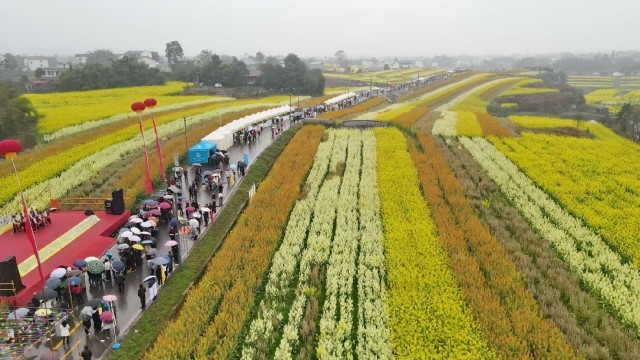 花田中央,一方舞台搭在阡陌之间。曲艺婉转、舞姿翩跹,文艺演出以天为幕、以花海为景,赢得观众阵阵掌声。台下,岳池米粉、黄龙贡米等本土优质农产品的展台前,游客们争相品尝、选购。商户卿勇军忙得不亦乐乎:“五彩花海给我们带来了人气,更带来了财气。我们的生态农产品借这阵‘春风’,也被更多游客看见和认可。”