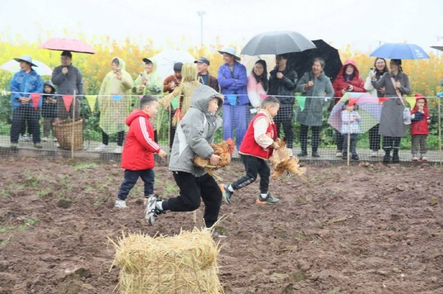 在“五彩”的加持下,今年的活动不仅好看,更加“好玩”。击云锣的清脆声、捉春鸡的欢笑声、套鸭子的喝彩声,在花田间此起彼伏,交织成一首春日交响曲。在“花田捉鸡”区域,几只土鸡在田埂上东躲西藏,惹得大人孩子满田追逐。小朋友黄若惜脸上挂着汗珠,怀里紧抱着一只“战利品”,兴奋地朝妈妈喊:“我抓到鸡了!今天太开心了!”围观群众的加油声一浪高过一浪。