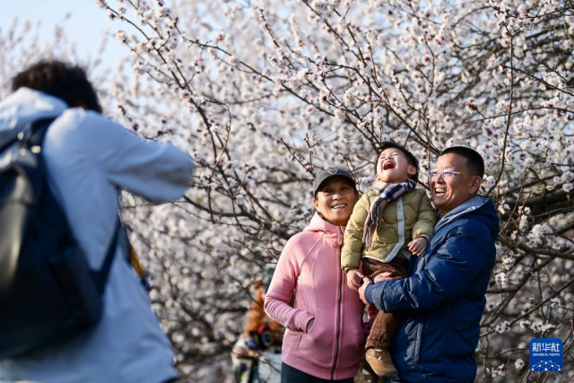 3月9日,游人在西安大明宫国家遗址公园赏花留影。