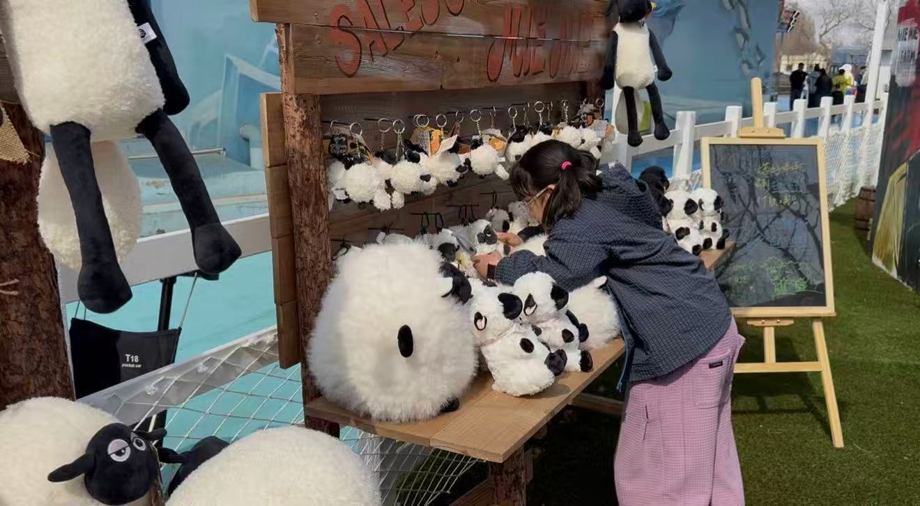 尤为亮眼的是,“咩咩农场”还推出了以瓦莱黑鼻羊为原型的原创动物IP——“夹克”与“肉丝儿”。这对呆萌可爱的IP形象不仅作为农场的专属文化符号遍布各处,更衍生出系列原创IP音乐、主题歌舞演出及丰富多样的文创周边。在咩咩舞台区域,原创小羊主题音乐歌舞演出精彩上演,牛仔NPC化身农场伙伴与游客亲密互动,让欢乐氛围持续升温。游客还可前往文创市集区挑选心仪的IP衍生品,或品尝特色主题美食,全方位构建“可看、可玩、可购、可留”的立体化文旅体验。