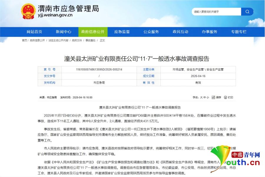 中国青年网讯(记者 代红玉 见习记者 张瑶)近日,陕西省渭南市应急管理局发布《潼关县太洲矿业有限责任公司“11·7”一般透水事故调查报告》(下称《报告》),对外公布2025年11月7日发生在潼关县太洲矿业蒿岔峪PD68副井透水事故的调查详情。该事故造成井下11名工人遇险,其中9人安全升井,2人遇难,直接经济损失431.5万元。
