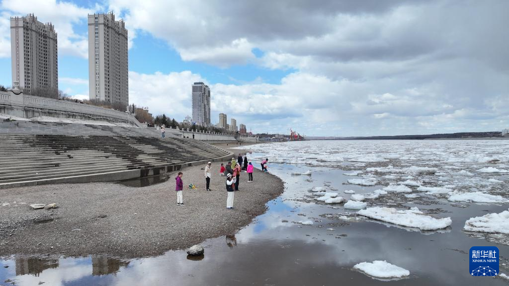 4月27日,市民在拍摄黑龙江黑河段“跑冰排”景象(无人机照片)。