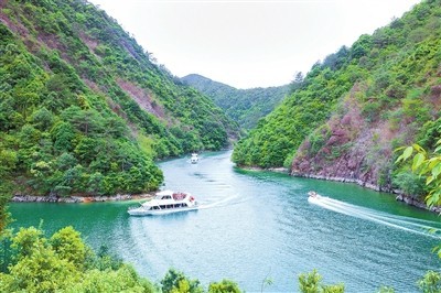 游客坐游船在东风湖内观赏山水生态美景。叶栋 摄