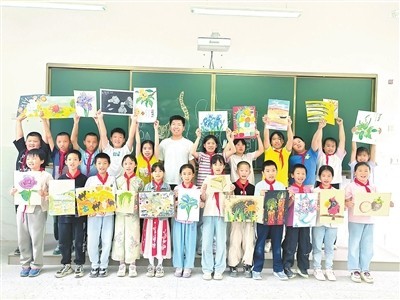 ↑孩子们在展示绘画作品。