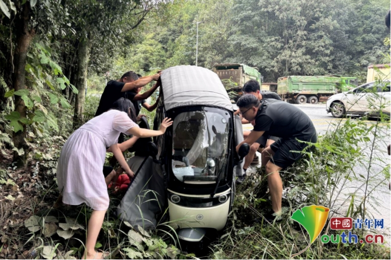 当天,上犹县应急管理局专业森林消防大队正如往常开展野外拉练。行至某路段时,大队长方泳突然发现前方一辆电动三轮车发生侧翻。一名青年女子已从驾驶座自行爬出,神情惊慌失措,正围着车辆焦急呼救——原来,后座还有一名年轻男子被卡在座位间,动弹不得。