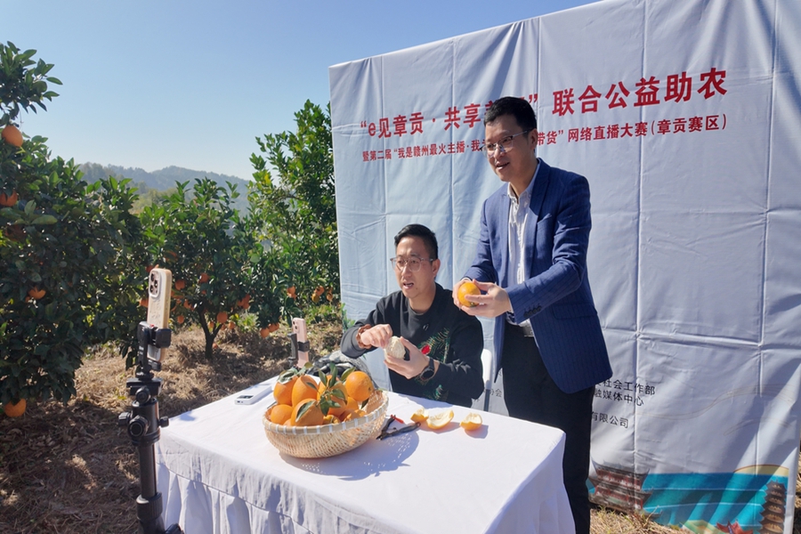 阳光洒满枝头,金灿灿的脐橙散发着诱人果香,主播们架起设备,在果树间开始了热火朝天的直播。“家人们看,这就是我们赣南脐橙,皮薄多汁,现摘现发!”章贡区融媒体中心主播大嘴和文舒边采摘边解说,直播间点赞数不断攀升。