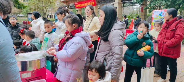 在“绘本糖画”环节,工作人员讲述了与糖画相关的绘本故事,让孩子们对这门古老技艺有了初步了解。随后,孩子们自己现场制作,金黄透亮的糖丝在孩子手中翻飞,转眼间便勾勒出栩栩如生的生肖造型。孩子们拿着刚做好的糖画,小心翼翼地舔舐着,甜在舌尖,乐在心头,脸上洋溢着满足的笑容。