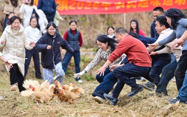 2月12日,赣州市章贡区沙石镇石角村,党员干部与村民共同参与抓鸡大赛,田间地头欢声笑语,年味十足。当日,该镇举办新春乡村趣味运动会,众多接地气的项目唤醒了乡土记忆、凝聚了浓浓乡情,以农旅融合赋能乡村全面振兴。特约记者胡江涛 摄