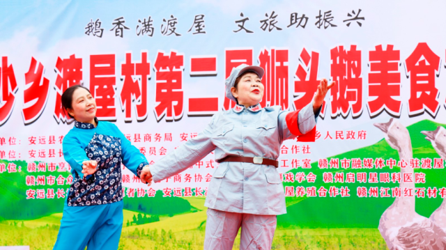 活动现场,美食区人气最旺,安远鹅肉丸、油浸鹅、咸鹅蛋,以及长沙乡全鹅宴、圆粉等特色美食备受青睐,销售火爆。文艺演出同样精彩纷呈,赣州市赣南采茶戏歌舞学会、赣州夕阳红艺术团的文艺志愿者们登台献艺,带来了极具客家特色的精彩表演。