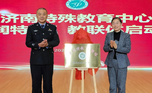 启动仪式上,济南市公安局网络安全保卫支队一大队副大队长王斌与济南特殊教育中心校长于生丹共同为“泉润特教”教联体揭牌。