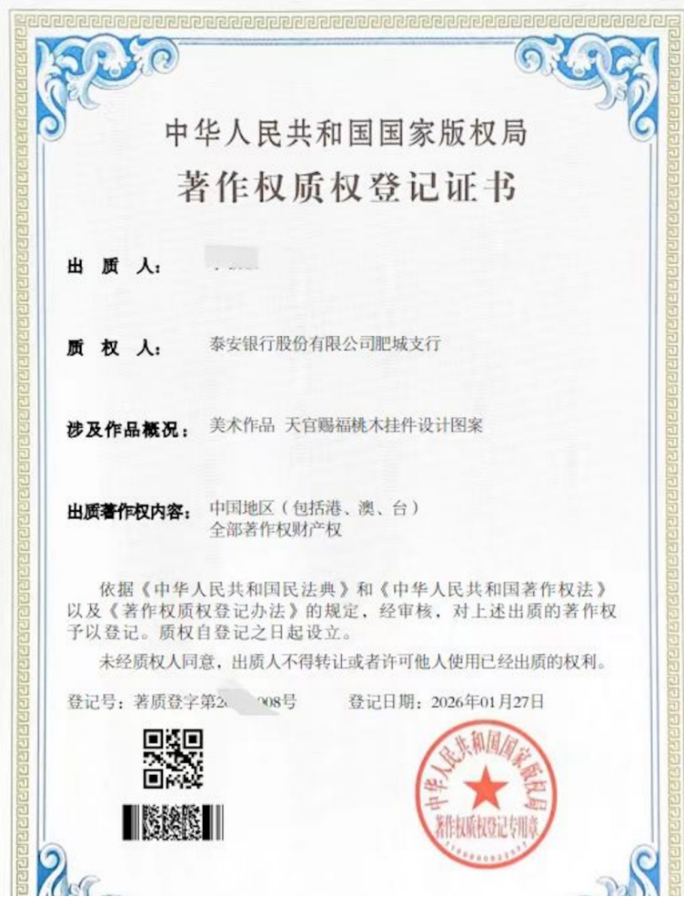 获得此项贷款的企业是泰安哪吒归来工艺品公司。该企业多年来深耕桃木雕刻传承与文创研发,手握多款原创桃木作品版权,属于企业的核心资产。目前,凭借核心作品的版权,哪吒归来工艺品公司成功获得泰安银行质押贷款并完成了放款。