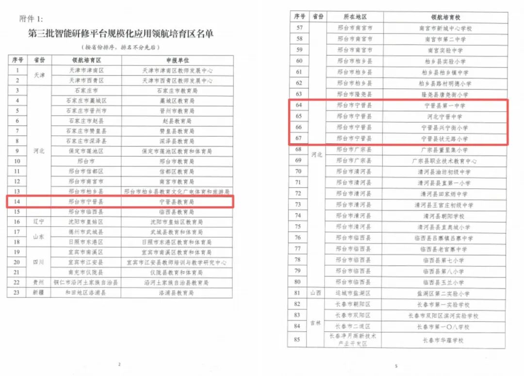 中国青年网讯近日,教育部教育技术与资源发展中心(中央电化教育馆)公布第三批智能研修平台规模化应用领航培育区(校)名单。宁晋县教育局成功入选领航培育区,宁晋中学、宁晋县第一中学、状元路小学、兴宁街小学4所学校入选领航培育校。