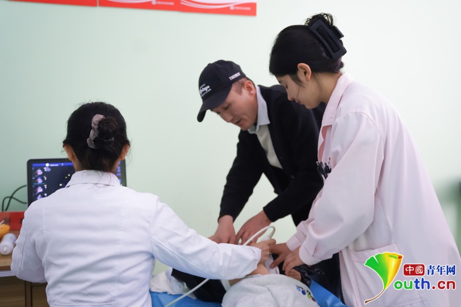 医疗团队领队在为疑似先心病患儿检查。陕西省青少年发展基金会供图